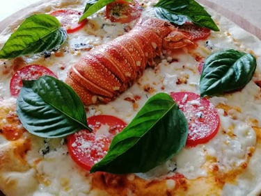 Sobre esta base perfecta, colocamos jugosa cola de langosta delicadamente sazonada, fundente mozzarella fresca, cremoso queso de cabra, rodajas de jitomate fresco y hojas de albahaca aromática. El resultado es una combinación equilibrada entre la dulzura marina de la langosta, la suavidad láctea de los quesos y la frescura vegetal del tomate y la albahaca.