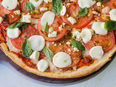 Base de auténtico tomate San Marzano, cremosa mozzarella fresca, hojas de albahaca recién cortadas y un delicado toque de aceite de oliva extra virgen.