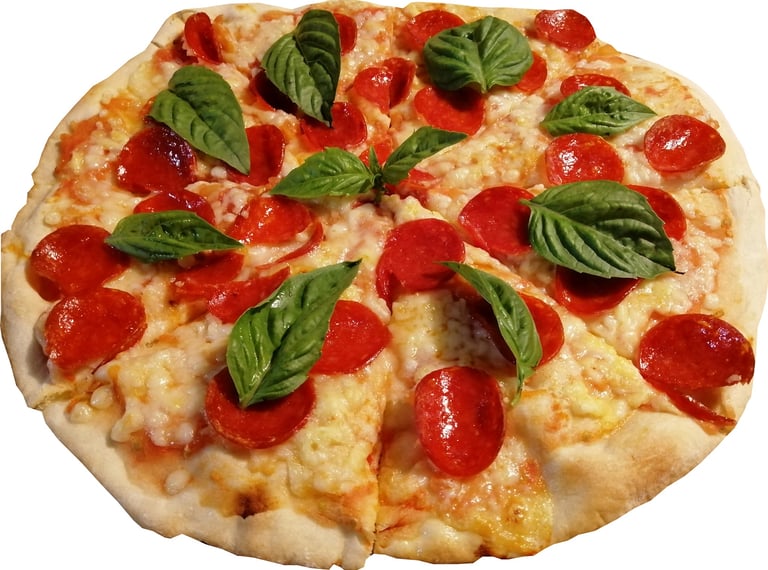 Se cubre con abundante mozzarella fresca que se funde perfectamente sobre la base, láminas de pepperoni ligeramente crujiente en los bordes y aromáticas hojas de albahaca que aportan frescura y equilibrio.