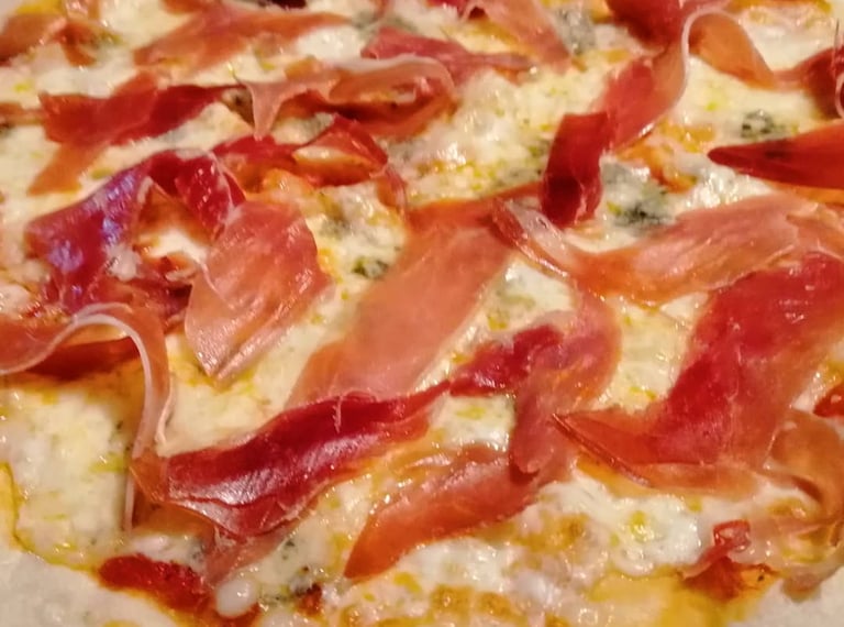 Se cubre con mozzarella fresca fundida, finas láminas de jamón serrano, crujiente tocino dorado al horno y toques de queso azul que aportan profundidad y personalidad. Las hojas de albahaca fresca equilibran el conjunto con su aroma herbal y fresco.
